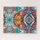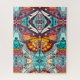 Puzzle in einem digitalen Batik-Muster eines großen Schmetterlings auf einem verzierten, arabischen Medaillon in den Tönen Bernstein, Orange, Aqua und Beige