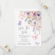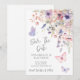 The card features watercolor wildflowers and greenery with fluttering pink and purple butterflies. Names and wedding date appear in a mix of handwritten script and clean serif fonts for a modern yet timeless look.