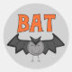 Ein schwarzer Halloween-Fledermaus und ein orangefarbener Text, der auf Fledermaus-T - Shirt, Karosserietexten, Tasse, Karten, Aufklebern, Totttaschen, Buttons, Magneten und anderen Halloween-BAT-T - Shirt und -Geschenken "BAT" liest.