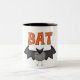Ein schwarzer Halloween-Fledermaus und ein orangefarbener Text, der auf Fledermaus-T - Shirt, Karosserietexten, Tasse, Karten, Aufklebern, Totttaschen, Buttons, Magneten und anderen Halloween-BAT-T - Shirt und -Geschenken "BAT" liest.