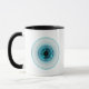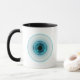 Ein cybernetisches blaues Auge mit verschiedenen digitalen Displays, darunter Kreise, Punkte und Quadrate, einige beleuchtet und andere nicht, mit einem kleinen Kreuzhaar in der Mitte und das Wort "Vision" hinten rechts unten.