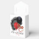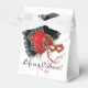 Weißes Zelt-Stil mit weißem Band-Gunst-Box mit Cabaret-Bild, vorne und hinten, mit schwarzem Federgebläse, rotem und schwarzem Ballon und roter Maske. Optionaler Text Wir schlagen vor, das weiße Band in rot oder schwarz Satin zu ändern, um ein komplementäres Aussehen zu erhalten. Siehe entsprechende Einladung, Konfetti, Gefallen-Tasche, Gefallen-Tag, Geschenktaschen, Rundaufkleber, maßgeschneiderte Vinyl-Aufkleber und Packpapier. Sehen Sie sich die gesamte Cancan Favor Box-Kollektion in den SPEZIELLEN TOUCHS an. | Abschnitt Gastgeschenke.