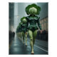 Ein surreales und zum Nachdenken anregendes Bild, das eine Reihe von Figuren zeigt, die in aufwändigen Kohlensüften gekleidet sind, die eine nasse Straße hinunter gehen. Jede Figur trägt ein großes, realistisches Kohlkopfteil und eine grüne, grüne, grüne, weiße Kleidung, die sich ihre Beine hinunter zieht und einer Verschmelzung von Mensch und Gemüse ähnelt. Die Figuren sind aus einem leicht tiefen Winkel zu sehen, große, graue Gebäude im Hintergrund und Zuschauer aus den Bürgersteigen. Die Atmosphäre wirkt etwas gedämpft und neblig.
