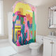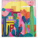 Eine lebendige Wüstenlandschaft mit blühendem Kakteen, bunten geometrischen Gebäude und einem leuchtenden Sonnenuntergang. Die kühne Farbpalette verbindet warme Farbtöne, Gelb und tiefer Blues und schafft eine lebendige südwestliche Atmosphäre. Ideal, um jedem Raum eine Touch von Wärme und künstlerischem Charme zu verleihen!
