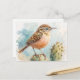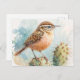 Diese Postkarte zeigt ein Aquarellbild eines Kaktuswrens, das den Wüstengeist mit lebendigen Details und einem sanften künstlerischen Flair einfängt. Die Kaktuswren, bekannt für ihre kühne Persönlichkeit und ihre unverwechselbaren Markierungen (und Arizona-Staat), werden mit warmen Erdbraun, weichem Pfirsich und subtilen weißen Streifen dargestellt, die ihre faszinierenden Federmuster hervorheben. Der scharfe Blick des Vogels und die zarten Merkmale stehen im Kontrast zu den robusten Texturen des Kaktusvogels. Der Hintergrund verbindet sanfte Blues mit sanftem Beige und schafft ein ruhiges Wüstenambiente, das die natürliche Schönheit des Themas unterstreicht. Dieses Kunstwerk ist perfekt für Vogelbeobachtung-Liebhaber und den südwestlichen Flair geeignet und zelebriert die Widerstandskraft und den Charme der Kaktuswelt.
