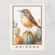 Diese Postkarte zeigt Wasserfarbenkunst eines Cactus Wren, der auf einer dornigen Sukkulente sitzt. Das Vogelkunstwerk ist von einem dunklen Rand eingerahmt, und das Wort 'Arizona' befindet sich darunter, was den kleinen Wüstensangvogel als Staatvogel ausweist.