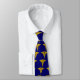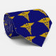 Diese blaue Krawatte ist mit mehreren Bildern eines goldenen Kadukeus geschmückt.