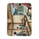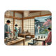 Ideal für den Kaffee und Reisende. Die Aquarellmalerei zeigt wunderbar die ruhige und harmonische Atmosphäre eines ruhigen Cafés in Kyoto. Die warmen Holzpaneele und Shoji-Bildschirme strahlen sanft das Sonnenlicht in den Raum ein und sorgen für ein einladendes Glühen. Die niedrigen Holztische mit Täami-Kissen sorgen für eine traditionelle Touch, während die schlichten, schwarzen Lampen einen modernen Kontrast schaffen. Ein Barista in einer Schürze aus Leinen bereitet in anmutiger Weise den Kaffee zu, der in der ruhigen Umgebung zart ansteigt. Eine Frau in einem hellblauen Kimono genießt eine Matcha Latte, und ein paar in der Nähe teilen wagashi Süßigkeiten, ihre lebhaften Ausdrücke, die Wärme hinzufügen. Hinter den großen Schiebetüren erwartet Sie ein kleiner Zen-Garten mit Mosaiksteinen und einer Kirschblüte in voller Blüte, der die neutralen Beige- und Brauntöne des Innenraums ergänzt. Die Szene zeigt die perfekte Mischung aus Tradition und Modernität in Kyoto.