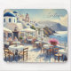Perfektes Geschenk für den Reise- und Kaffeeliebhaber. Die Aquarellmalerei zeigt den ruhigen und idyllischen Charme eines Cafés unter freiem Himmel in Santorin. Der Raum ist mit weißgetünchten Wänden mit blauen Akzenten und gewölbten Öffnungen ausgestattet, die einen atemberaubenden Blick auf das glitzernde Ägäische Meer bieten. Die Tische aus Holz mit Korbstühlen sind verstreut und mit Vasen aus lebhaften Bougainvillea-Blume geschmückt. Eine Theke aus Naturstein zeigt eine traditionelle griechische Kaffeekanne, Gebäck und eine Vintage Espressomaschine. Über dem Dach befindet sich eine Pergola aus Holz, die mit üppigen Weinbergen bedeckt ist und teilweise Schatten bietet. Auf dem Boden aus Stein ist das Tageslicht gedämpft. Gönnen Sie sich einen Kaffee und schauen Sie entweder auf das Meer hinaus oder unterhalten sich in ruhiger Atmosphäre. Santorin ist eine der schönsten Städte der Welt. Die Farben Weiß und Blau harmonieren wunderbar mit der natürlichen Schönheit der umliegenden Landschaft.
