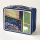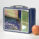 Das Kunstwerk an dieser Lunch Box ist ein Originalfoto von ZoeSPEAK eines rustikalen Café Schildes und Fensters außerhalb des ländlichen Cafés. Es ist ein buntes, handgemaltes Schild mit grünen, weißen und blauen Buchstaben und musikalischen Noten auf dunklem Hintergrund, in einem Rahmen aus Holz. Das Schild hängt an einer hellgelben Wandverkleidung mit rosa im Schatten, neben einem Fenster mit hellgrünen Jalousien, das innen hängt, und einem weißen, die Baumzweige reflektierenden Highlight-Bereich.