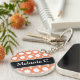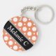 Moderner runder Acryl-Schlüsselanhänger mit zwei Seiten mit einem Polka-Dotmuster mit wechselnden Größen weißer Kreise über einer Orange im Café. Ihr Name oder benutzerdefinierter Text wird auf beiden Seiten diagonal in Weiß über einen schräg verlaufenden schwarzen Streifen gedruckt.