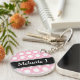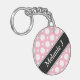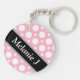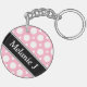 Moderner runder Acryl-Schlüsselanhänger mit zwei Seiten mit einem Polka-Dotmuster mit wechselnden Größen von weißen Kreisen über einem Café-Stil rosa. Ihr Name oder benutzerdefinierter Text wird auf beiden Seiten diagonal in Weiß über einen schräg verlaufenden schwarzen Streifen gedruckt.