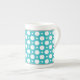Entbeinen Sie die China-Tasse, die mit einem sortierten Polkapunktmuster mit wechselnden Größen der weißen Kreise über einem Café-ähnlichen Türkis entworfen ist und auf der Spitze und der Unterseite im Grau umrissen ist.