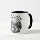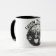 A black-and-white vintage illustration featuring a steaming coffee cup set in a scenic camping landscape with mountains, trees, flowers, and a flowing river.