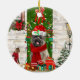Cairn Terrier Hund sitzend außerhalb dekoriert Zuhause mit Weihnachtskranz, Weihnachtsbaum ist eine perfekte Weihnachtsgeschenk Idee für Hundefreunde.