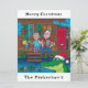 Aquarellbilder von Oma und Opa, die auf der Veranda ihres Blockhüttenhauses Akkordeon spielen, mit einem freundlichen grünen Alligator Sprichwort "Frohe Weihnachten.