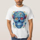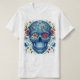 Un diseño absolutamente precioso con fondo blanco de una calavera azul que está rodeada de flores, realmente muy bonito.