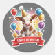 Realistic calf wearing a tiny party hat, surrounded by sparkling confetti and colorful balloons. Bright, photorealistic, and festive Happy New Year sticker