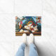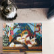 Calico Katze spielt mit einem roten chinesischen Drachen vor einem Pfauenfenster.