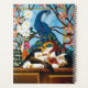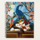 Calico Katze spielt mit einem roten chinesischen Drachen vor einem Pfauenfenster.