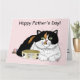 Eine niedliche Calico-Katze sitzt neben ihrer Speisekarte und wünscht ihrem Cat-Vater einen glücklichen Vatertag.