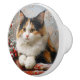 Postkartenkunst mit einem Gemälde einer schönen Kalico Katze in einer Winterlandschaft umgeben von roten Beeren, Kiefernspießen und gemütlichen Stoffen.
