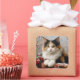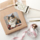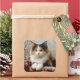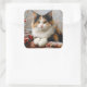 Viereckige Aufkleberkunst mit einem Gemälde von einer schönen Kalico Katze in einer Winterlandschaft umgeben von roten Beeren, Kiefernspießen und gemütlichen Stoffen.