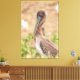 Ein nah-up Foto erfasst ein braunes Pelikan, dessen Kopf zur Seite gedreht wurde, und zeigt seinen charakteristischen langen Schnabel und gefederten Körper. Der Absturz des Pelikans ist eine Mischung aus braun, grau und weiß, mit einem Orangen-Hauch an der Spitze des Schnürsenkels. Der Hintergrund ist beige und grün, was auf einen natürlichen Lebensraum hindeutet.