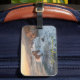 Beautiful luggage tag with an image captures a scenic California coastal view with waves crashing against rocky formations. The ocean water is a mix of deep blues and foamy whites, creating a dynamic texture. Jagged rocks jut out from the sea, some being struck by powerful waves. The coastline is visible in the background, with mountains fading into a hazy sky.