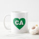 Diese Tasse zeichnet sich durch ein lebendiges grünes Herz aus, das die fett-, weiß-, Großbuchstaben CA, die offizielle Abkürzung für Kalifornien, den goldenen Staat, enthält.