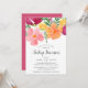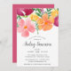 Elegante Blumendusche mit einer Kaskade von Mohnwasserfarbe in lebhaften Pfirsichtönen, Rosa und Violett. Personalisieren Sie Ihre Babydusche in einer schicken Mischung aus Block-, Serif- und Kalligraphie-Schriften.