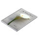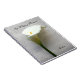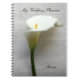 Eine schöne weiße Calla-Lilie mit einem alten Skript-Hintergrund auf einem spiralgebundenen Notebook, um Ihre Hochzeitsdetails zu organisieren.