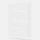Ein minimalistisches weißes Begrüßungsschild mit elegantem Kalligrafieschrift, gedruckt auf transparentem Acryl. Passen Sie die Farben an, um sie Ihrem Thema anzupassen.