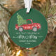 Moderne Kalligraphie Herzstück Unsere ersten Weihnachten als Mr. und Mrs. - Watercolor Vintag Red Truck Ornament - Forest Green Background