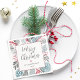 Modernes Design mit knusprigen Weihnachtsgrün rund um die Papierserviette mit weißem KastenOverlay. Frohe Weihnachten in Schriftzeichenschrift und Familienname, datiert in modernem Schriftart.