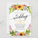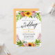 Modernes Kalligraphie-Script, Aquarell Sonnenblume Boho Blütenblume mit Rose, Peonies und Grün Einladung Hochzeit. Gelbe Sonnenblumenfarbe zurück.