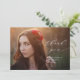 Dieser hübsche Abschluss Dankeschön-Karte verfügt über ein volles Foto und moderne Kalligraphie. Das weiße Überlagerungsschreiben enthält den Satz "danke", der in eleganter Schrift geschrieben wurde, mit dem Namen des Absolventen und dem Abschluss Jahr unten. Die Typografie überlagert ein volles horizontales Foto des neuen Abschlusses. Sie können auf Wunsch zusätzliche Fotos und/oder eine benutzerdefinierte Meldung auf der Kartenrückseite hinzufügen.