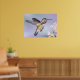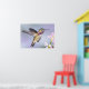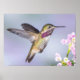 Rosa und lila Poster mit einem wunderschönen Kalliopugel, der über gelbe und rosa Lantana-Blume fliegt und seine Flügel voll ausdehnt im Rücken und seine irisierenden Magenta-Rachenfedern zeigt. Schöne und einzigartige Wanddekoration für Kolibris, Gärten und Naturliebhaber. Der Kolibri ist der kleinste Vogel Nordamerikas und trägt den Namen der Muse Calliope in der griechischen Mythologie. Foto aufgenommen in Pasadena, Kalifornien.