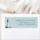 This return address label features a charming lighthouse illustration set against a soft blue background, evoking a serene coastal atmosphere. The design combines minimalist and modern aesthetics with traditional nautical elements, using a limited color palette of blues, whites, and reds for a classic look. Clean serif typography enhances readability, making it perfect for personalizing your mail. Ideal for those who appreciate maritime themes, this label adds a touch of elegance and nostalgia to any correspondence.