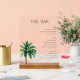 This wedding menu features a minimalist design with a central palm tree illustration, evoking a tropical and relaxed vibe. The layout is clean and uncluttered, with ample white space that highlights the elegant serif font used for "THE BAR" title and the organized lists of beer, wine, and spirits in a crisp sans-serif type. The color palette includes soft greens for the palm fronds and muted tones for the text, creating a sophisticated yet inviting atmosphere perfect for an upscale event. The modern style emphasizes simplicity and functionality, making it ideal for couples seeking a chic and contemporary look for their special day.