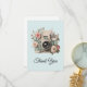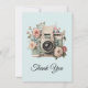 Thank you card with a vintage styled camera decorated with flowers. Pastel colors of pink, cream and green.