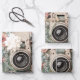 Wrapping paper sheets with a vintage styled camera decorated with flowers. Pastel colors of pink, cream and green.