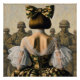 das raffinierte Kleid einer Frau mit militärischen Elementen und das robuste Aussehen der Soldaten, die sie befehligt.
