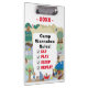 Camp oder Road Trip Clipboard Löschen Sie den Text und ersetzen Sie ihn durch Ihren eigenen. Wählen Sie Ihre Lieblingsfarbe, -größe und -art für den Schriftart aus. Machen Sie es sich selbst auf dieser zweiseitigen Zwischenablage. Glückliches Camping!!! Stil: Die Zwischenablage Bleibe organisiert und stilvoll, mit individuellen Clipboards aus Zazzle! Nutzen Sie Ihr Lieblingsdesign, Ihre Bilder oder Ihren Text, um dieses Grundschulangebot in ein atemberaubendes Accessoire zu verwandeln, das Sie auf der Strecke behalte, immer! Abmessungen: 12,5"l x 9"w; Dicke: 0,125" Designed for Letter und A4 size paper Holt bis zu 0,5 Zoll Papier sicher hergestellt aus ultra-haltbarem Acryldruck auf beiden Seiten /!\ WARNUNG:CHOKING HAZARD - kleine Teile. Nicht für Kinder unter 3 Jahre geeignet.