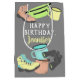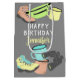 Diese Geschenktasche ist ideal zum Umpacken von Geschenken mit einem Outdoorsthema. In der Tasche finden Sie Abbildungen von Wanderstiefeln, Ferngläsern, Emaille-Tasse und fantasievollen Päckchen in hellen Sommerpastells vor dunkelgrauem Hintergrund. Es ist bereit, mit Ihrem eigenen Slogan oder Gruß und dem Namen Ihres Empfängers personalisiert zu sein.