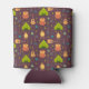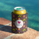 Kann Kühler mit einem niedlichen Camping-Muster. Camping-Themen wie ein orangefarbenes Lagerfeuer, ein grünes Zelt, eine akustische Gitarre und andere Naturelemente wie Bäume, Blätter, aber auch ein Rucksack, Schaufel und Kantine. Ein weißer Kreis überlagert mit einem roten Herz und das Wort "Camping" innen.