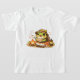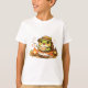 An adorable illustration of a chubby green frog on a camping adventure. Wearing a tiny explorer hat and backpack, the frog sits by a campfire roasting marshmallows while holding a map. A glowing lantern, mushrooms, and a smiling snail complete the cozy outdoor scene. The warm tones and sparkles add to the charm and whimsy.