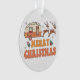 Camping Merry Christmas Reindeer Typography Ornament features the text "Merry Christmas" in a retro script typography with a festive decorated caravan being pulled by reindeer and accented with snowflakes and holly. Designed by Evco Studio www.zazzle.com/store/evcostudio