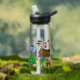 Blockhütte zum Thema Camping, Feuer, Zelt, s'mores, Angeln, Boot, RV Camper und Froschwasserflasche.