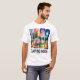 Dieser weiße T - Shirt weist vier verschiedene senkrechte Abschnitte auf, die ein Camping in verschiedenen Zeiten darstellen. Ausgehend von den links: ein Waldgebiet in der Dämmerung, ein klassischer Camper-Van auf einer sonnigen Wiese, ein Seefeld unter einem bunten Abend, und ein gemütliches Zelt, das nachts von einer Laterne mit Vollmond beleuchtet wird. Die Wörter "CAMPING MODE" sind unten in einem stilisierten Schriftart.